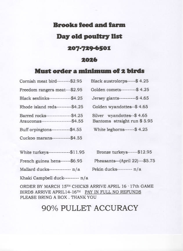 Brooks Feed & Farm — 2026 Day-Old Poultry List